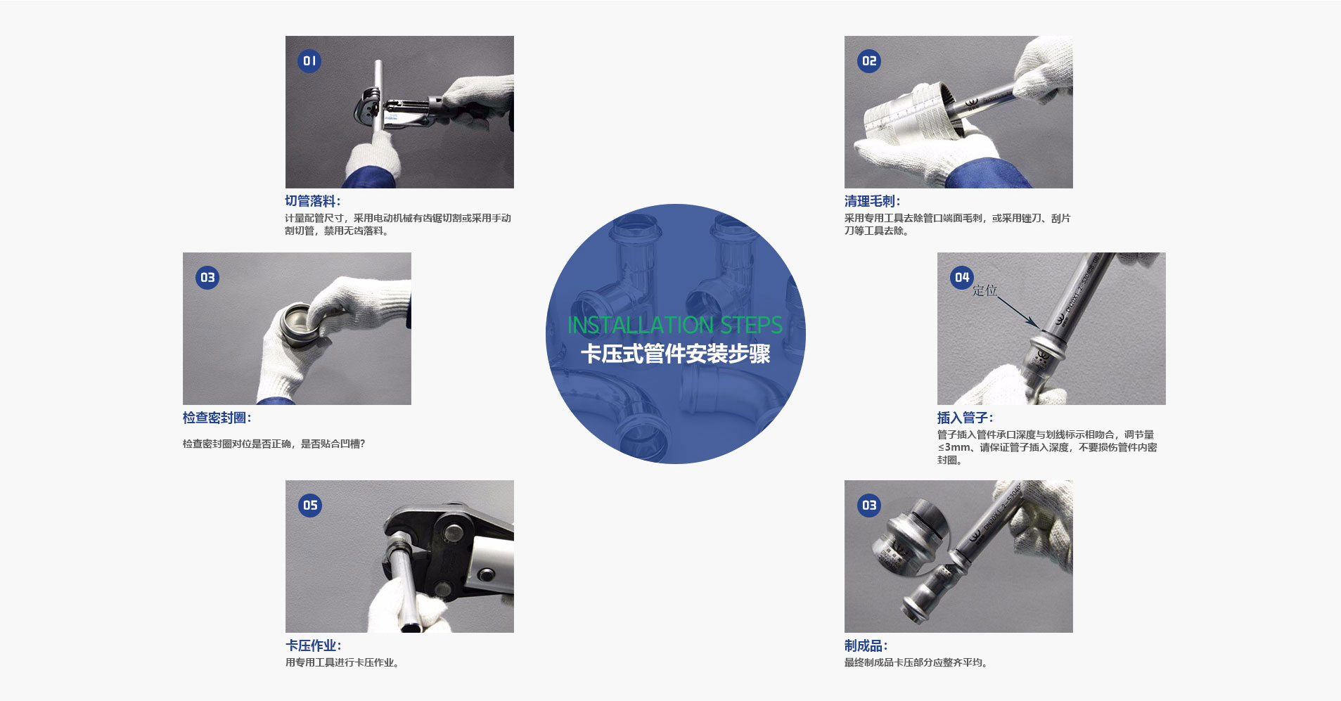 9、合適嵌入式安裝:卡壓式管件滿(mǎn)足嵌入式安裝要求,可明裝,也可埋墻安裝